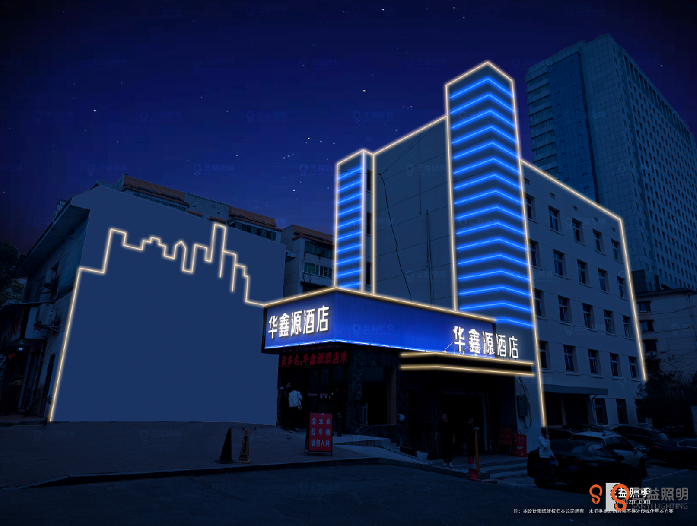 益陽市銀座商務(wù)酒店外墻燈光設(shè)計(jì)項(xiàng)目,本項(xiàng)目采用LED發(fā)光字,LED線條燈,LED十字星燈等燈具,對外墻進(jìn)行亮化。